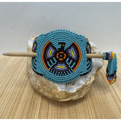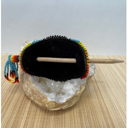 Chaque pièce est unique et réalisée avec minutie à partir de petites perles colorées, assemblées une à une pour créer des motifs vibrants et authentiques. Elles sont montées sur un support en cuir de vachette, offrant à la fois solidité, confort et durabilité.