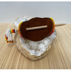 Chaque pièce est unique et réalisée avec minutie à partir de petites perles colorées, assemblées une à une pour créer des motifs vibrants et authentiques. Elles sont montées sur un support en cuir de vachette, offrant à la fois solidité, confort et durabilité.