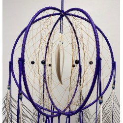 Attrape-rêves en forme de sphère composé de trois cerceaux métalliques, soigneusement enroulés de cuir de vachette.