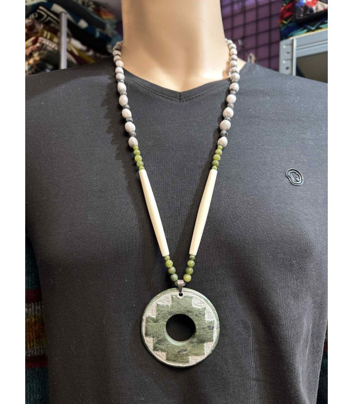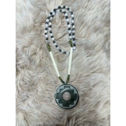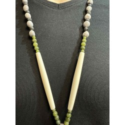 Ce collier serait un mélange unique de différentes matières naturelles, créant un look bohème et authentique. Il serait à la fois artistique et symbolique, portant des énergies positives et favorisant l'équilibre et la guérison intérieure.