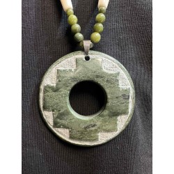 Collier de protection chamanique avec pendentif chakana en pierre de jade . Chakana, également connue sous le nom de croix inca, est un symbole religieux andin utilisé par les Incas et d'autres peuples autochtones des Andes. Il est composé de trois escaliers et représente la connexion entre les mondes supérieur, terrestre et inférieur. Le chakana est souvent utilisé dans l'art et l'architecture inca, ainsi que dans les cérémonies chamaniques et autres cérémonies .