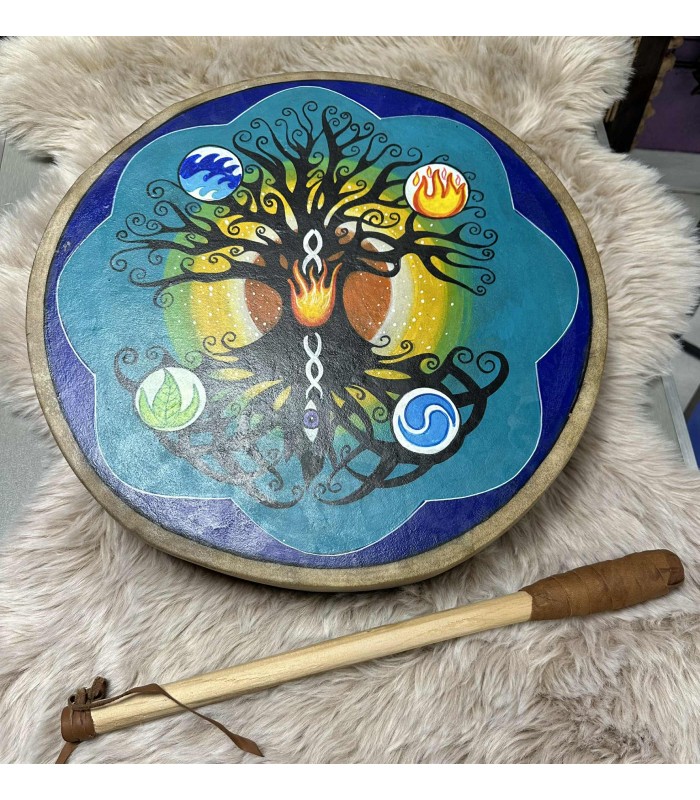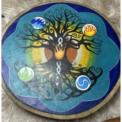 Au centre, l’Arbre Sacré relie les forces de la nature et symbolise l’équilibre. Autour de lui, les quatre éléments rappellent l’importance de l’harmonie entre la Terre, l’Eau, le Feu et l’Air. Ce tambour offre un son profond et naturel, idéal pour la méditation, les soins ou simplement pour se recentrer.