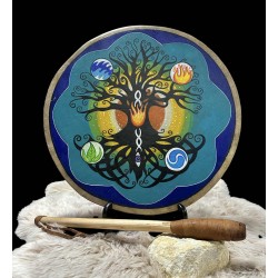 Au centre du tambour, l’Arbre Sacré symbolise la connexion entre l’humain et les forces de la nature, tandis que les quatre éléments – Terre, Eau, Feu et Air – rappellent l’importance de l’équilibre et de l’harmonie dans nos vies. Sa sonorité riche et profonde crée un espace de calme, propice à la méditation, au voyage intérieur ou aux cérémonies personnelles.