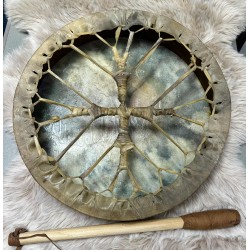 Chaque étape de sa création est réalisée avec respect et soin : de la préparation minutieuse de la peau au montage du cadre, en passant par le tressage précis du lacage et la mise en vibration finale. Cet instrument n’est pas seulement un objet décoratif, il est pensé pour accompagner vos pratiques méditatives, vos soins énergétiques ou simplement vos moments de recentrage intérieur.