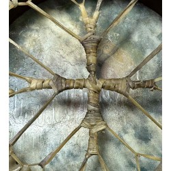 Tambour chamanique a été fabriqué à la main de façon traditionnelle, avec une peau de vachette soigneusement tendue sur un cercle de 40 cm. Chaque étape de sa création a été réalisée avec respect : préparation de la peau, montage du cadre, tressage du lacage et mise en vibration.
