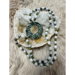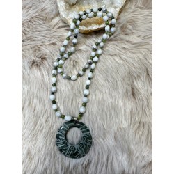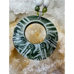 La pièce maîtresse est un pendentif en jade néphrite sculpté, d’un diamètre de 5,50 cm, présentant des motifs tribaux qui renforcent son caractère spirituel et protecteur. Chaque élément est monté à la main, faisant de ce collier une création authentique, symbolique et chargée d’histoire.