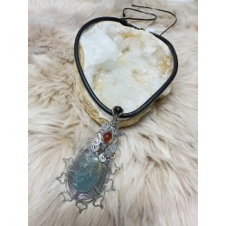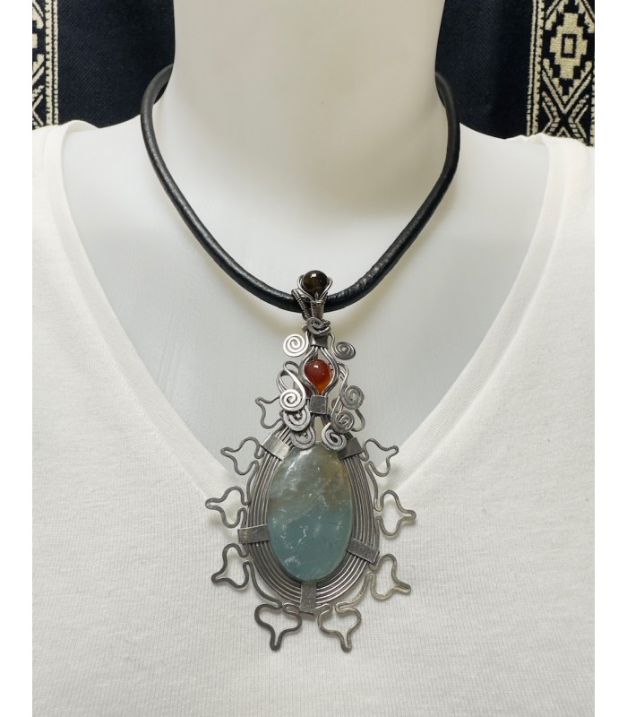 Découvrez ce pendentif artisanal Énergie Trio, une création unique mettant en valeur trois pierres naturelles : aigue-marine, cornaline et obsidienne.