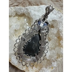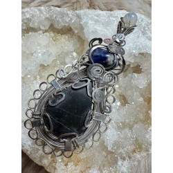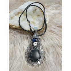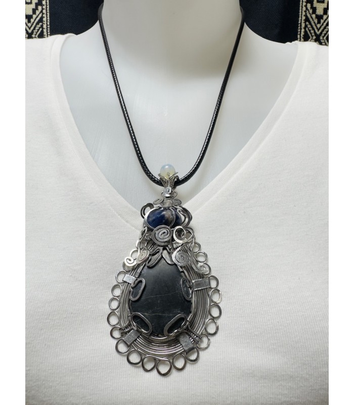 Pendentif artisanal est réalisé en wire-wrapping et met en valeur une onyx noire associée à une pierre bleue, lapis-lazuli ou sodalite. Chaque fil est soigneusement travaillé à la main pour créer un design harmonieux et unique. Un bijou authentique qui allie élégance, énergie naturelle et savoir-faire artisanal.