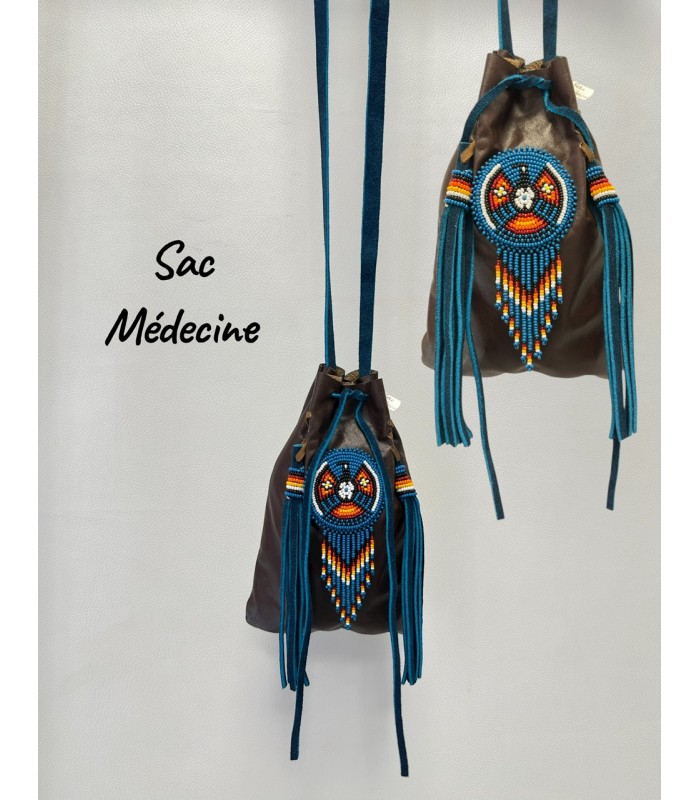 Sac médecine, confectionnés à la main avec cuir, perles et tissus colorés, sont bien plus que de simples accessoires. Dans la tradition des peuples natifs d’Amérique, ils sont considérés comme des objets sacrés utilisés pour garder des éléments porteurs de force, de protection et d’équilibre spirituel.