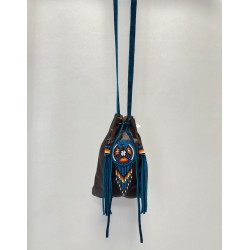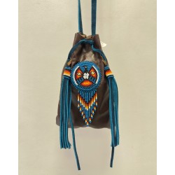 Sac médecine amérindien , fabriqué artisanalement en Équateur . Taille 21 centimètres , sur 15 centimètres . Ce sac est fabriqué en cuir de vachette est décoré avec des perles de rocailles .